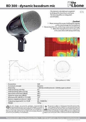 Its moving coil capsule forms a cardioid pickup pattern and is capable of capturing even the deepest sub-bass frequencies. the t.bone BD 300 delivers a mid-scooped sound with a punchy attack. You get a signal that sounds great even without EQ, but still gives you all the opportunities to create your sound.