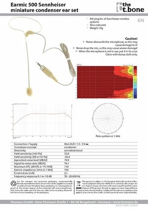 With its frequency response of 50 Hz to 20,000 Hz, this microphone covers all audio frequencies relevant to the human voice, omitting only the very low bass frequencies of the audible spectrum. This means that no detail gets lost during the miking process, ensuring a natural sound at the output. The t.bone Earmic 500 is not only visually unobtrusive, but also weighs just 13 grams, which means it can be used for extended periods of time without becoming uncomfortable. The microphone comes with a small zippered carrying bag with three accessory pockets. Replacement windscreens can be purchased separately.