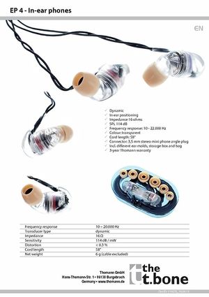 With an impedance only 16 ohms, the t.bone EP 4 connect to all amplifiers – even less powerful ones – and produce up to 114 dB/mW. Classic dynamic (moving coil) wideband drivers cover the frequency range from 10 Hz up to 20 kHz, thus covering the whole spectrum a human can hear. This pair of in-ears sounds linear, very punchy and clear and delivers all the details needed for a perfect performance. The lightweight (6 grams!) EP 4s come with a box that holds the earphone bodies, earpieces and the cable, as well as an additional bag.