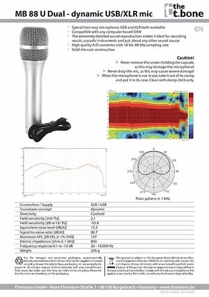 Weighing in at a mere 236 g, the MB 88U Dual is compact, convenient and suitable for recording voice, either sung or spoken, making it ideal for a wide range of applications. It also makes a great instrument mic, such as for an acoustic guitar, winds or even a cabinet. The built in analogue-to-digital-converter operates at 16 Bit and 48 kHz, delivering great quality performance directly into your digital audio workstation of choice. Podcasters will appreciate the plug-and-play nature of the USB connection, whilst the XLR connection enables it to be right at home on stage.
