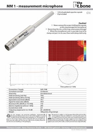 This measurement microphone doubles as a splendid recording tool, as pressure microphones deliver a very natural and highly detailed sound. A pair of t.bone MM-1s make a powerful and genuine sounding drum overhead. Need an affordable room microphone for your recordings or an additional precision mike for the guitar cabinet? MM-1! With a sensitivity of 19.6 mV/Pa and 110 dB SPL max., it is a welcome addition to your microphone locker. The microphone ships with a clamp for mounting it on a stand and a foam windscreen that comes in handy when you need to calibrate a PA system at an outdoor venue.