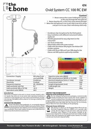 Its 130 millimetre gooseneck makes the t.bone Ovid System CC 100 easy to position. Various inexpensive clips and clamps are available for attaching it to any instrument. The detachable 2-metre cable leads to a screw-on EW plug that is compatible with Sennheiser EW wireless systems. The CC 100 comes with an adapter that allows you to connect the microphone to any standard XLR microphone input that supplies phantom power. Once you’ve used the CC 100, you probably won’t miss large studio condenser microphones or expensive stage microphones at all!